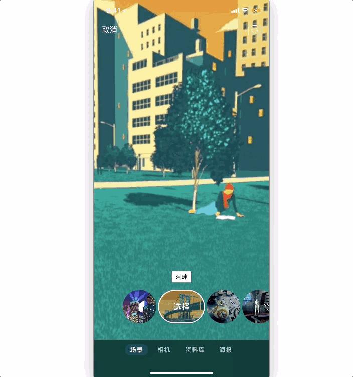 它可以直接帮你把背景抠掉,让你置身于抽象的动画场景里。你可以选择都市、外太空、抽象背景图等 12 种动画场景。