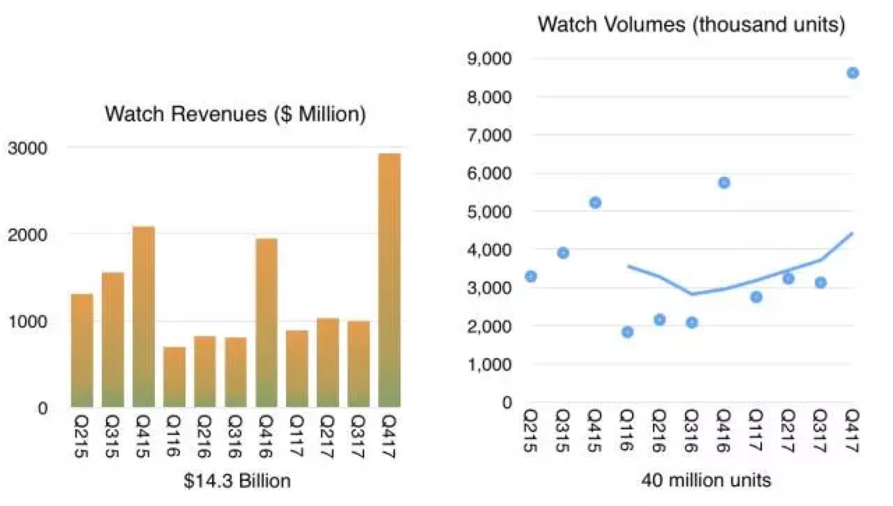 个人分析机构 Asymco 认为,如果 Apple Watch 能够继续保持良好的增长势头,那么其累积销量很可能将达到 4000 万只,累计销售额高达 143 亿美元。