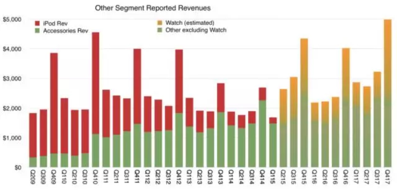 个人分析机构 Asymco 统计了近几年来 iPod、Apple Watch 和其他配件的销售情况。从这份图表上看,在 2009 年到 2012 年期间,iPod 仍然是苹果最主要的营收来源之一;而随着 iPhone 的崛起、苹果体系配件的日渐丰富(包括 Beats、AirPods 以及各种保护套等),iPod 能贡献的营收也越来越少。
