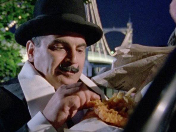除了信奉天主教,波洛另一大人生信条便是“唯有美食不可辜负”,他自己就曾说过“美食不仅是一种味觉享受,也是一种知识研究”;即便在《阳光下的罪恶》中胖到住院,他也要在推理前大吃一段。可谓是用生命在捍卫一个“吃货”的尊严。