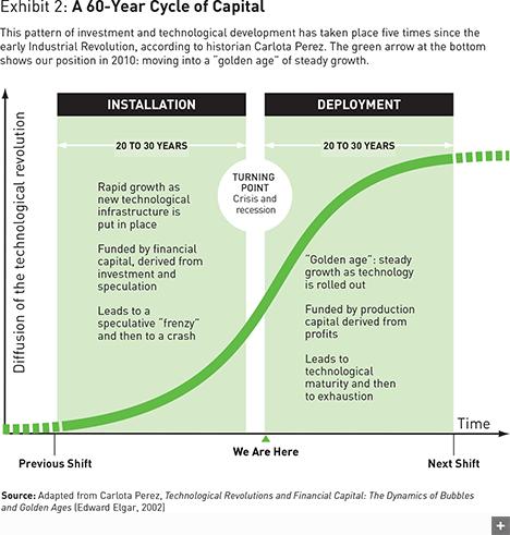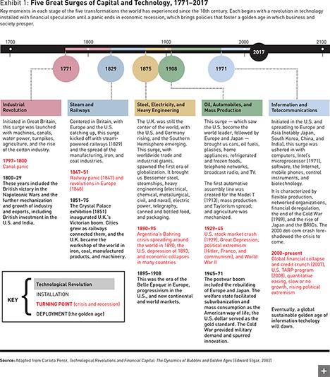 历史不会简单重复自己,但是会有周期循环。关于此类周期的一个最强的理论之一是经济历史学家Carlota Perez在《技术革命与金融资本:泡沫与黄金时代动力学》中所表述的东西。它认为,如果全球的关键决策者协调行动的话,人类就能够度过剧变和经济萧条然后进入到新的广泛经济增长的“黄金时代”。