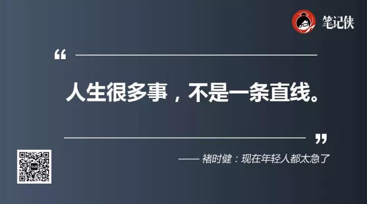现在社会上太多人想做些可以一蹴而就的事,都想找条直路走。尤其年轻人,大学读完书进入社会刚几年,就想搞出名堂,实际不是这样。人生很多事,不是一条直线。