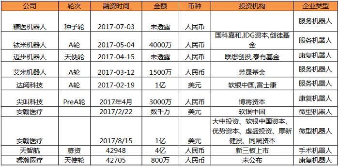 去年,动脉网在做2016年盘点的时候,一共有4家公司获得融资,分别是柏惠维康(手术机器人)、钛米机器人、达闼科技、礼宾医疗科技公司,去年大多为种子轮或者A轮融资,除了达闼科技的3000万美元,其他都是千万人民币级别的融资,加起来一共就2亿人民币,涉及领域包括手术机器人、服务机器人。