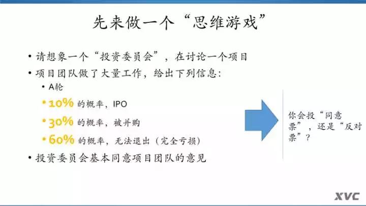 可能有些人已经发现我玩了个小花样。我给出的信息里面没有说明“假如成功了,回报是多少”。刚才没有人问我这个问题,而真实的场景中,投资委员会成员也常常会把这个重要信息忽略,大多数人只会用成功概率来做判断,但是不能把成功的“规模”考虑到公式里。