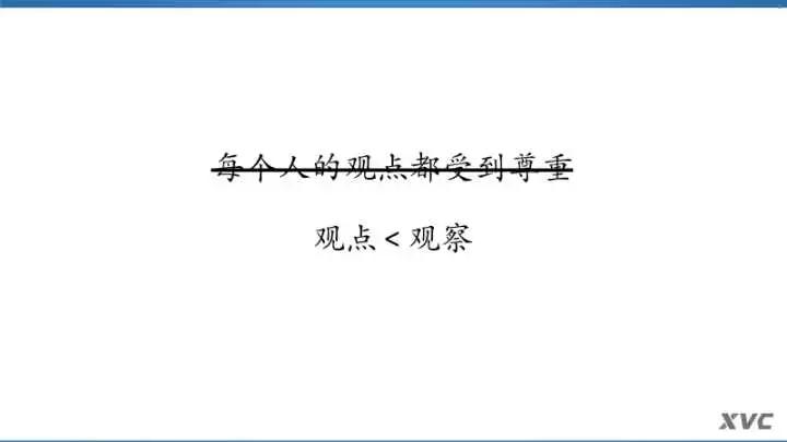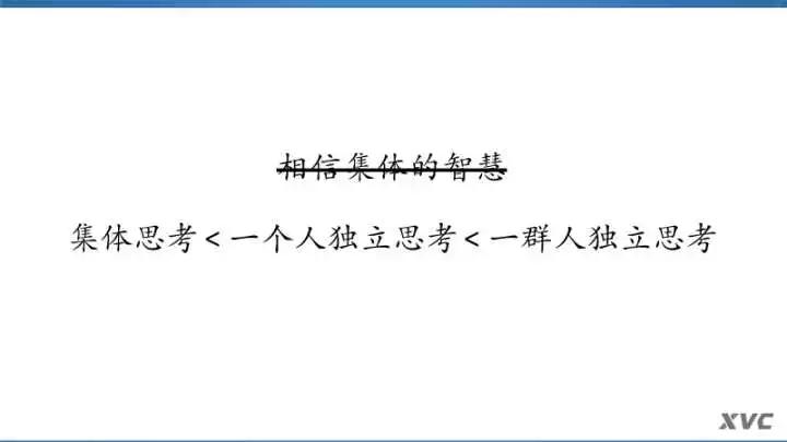 “集体的智慧”是符合人性的,这个词听着就顺耳,对吧。但是在XVC我们特别害怕这个东西。我们觉得,相比较之下,最低效的是集体思考,次之是一个人的独立思考,最高效的,是“一群人的独立思考”。