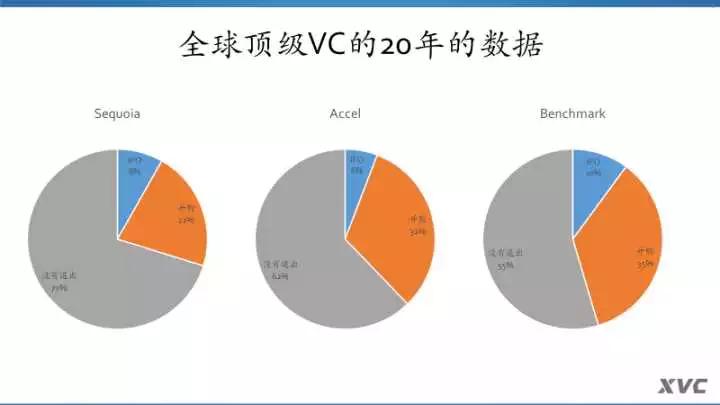 Accel所投的公司IPO有6%,并购占32%,还有62%没有退出。Benchmark,这也是一家非常牛X的投资公司,它的投资IPO占比10%,35%的并购,最大一部分55%也是没有退出。