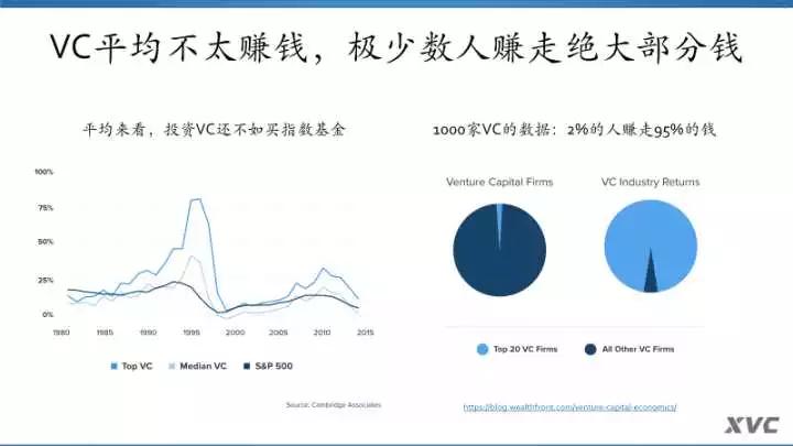 左边这张图里面,由深到浅的三根线,分别是S&P500、头部VC的回报、VC行业的平均回报。VC行业的平均回报,基本和S&P500指数持平,但是波动更大。所以平均来看,投资VC还不如买指数基金。