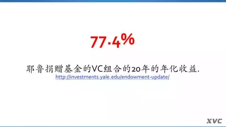 所以说做VC的LP也是一件挑战人性的事情。不过还是有人做出了不错的榜样。耶鲁大学捐赠基金的网站公布了他们的数据,他们过去20年的VC组合的年化收益率(IRR)是77.4%,我看到这个数字也惊呆了。