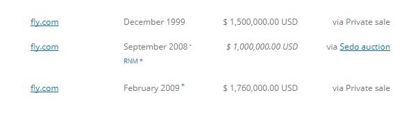 过往记录显示:Fly.com曾于1999年在一次非公开域名交易中,卖出150万美元的价格;2008年通过Sedo拍卖平台,以100万美元的略低价格转手易主;2009年的一次非公开交易中,该域名的售价上升到了176万美元。