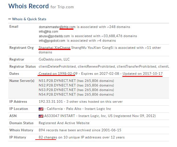 公开的域名注册记录显示:Trip.com的域名最先创建于1998年,IP历史经历过82次更改,域名的持有方也几经波折,注册信息的最近一次更新是2017年10月17日(现域名所有方是上海携程商务有限公司)。而Trip.com域名的几次倒手,背后也反映了曾经的旅游业巨头所历经的跌宕起伏。