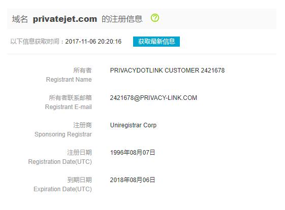 交易价格第二高的旅游域名是PrivateJet.com,公开资料显示,2012年一家名为Nations Luxury Transportation的公司出价3018万美元,从一家知识产权公司手中买下了PrivateJet.com的域名。目前这个域名的注册持有方是一家名为Privacydotlink Customer的公司,网站经营私人包机预订服务。