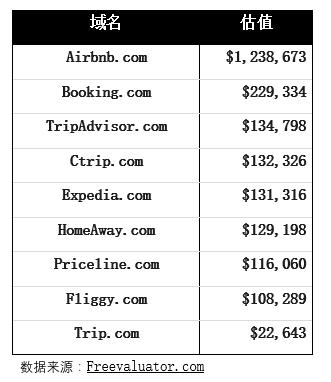 据域名估值平台FreeValuator的测算:TripAdvisor.com、Ctrip.com、Expedia.com、HomeAway.com、Priceline.com等主流旅游服务网站域名的机器估值均在10万-14万美元之间,琅琅上口的Booking.com域名,也只获得了22.9万美元的估值,实在令人咂舌。