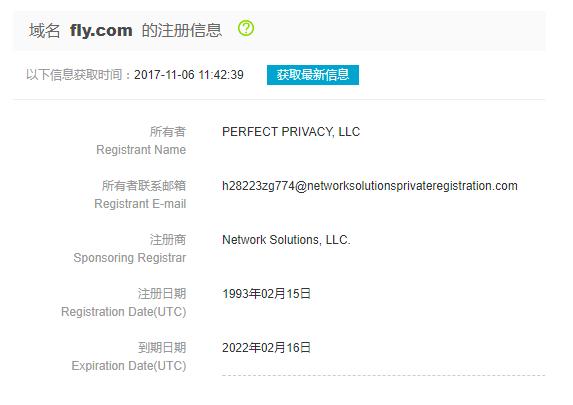据域名信息平台查询结果显示:目前Fly.com的注册所有者是一家名为Perfect Privacy, LLC的公司。访问该域名发现,该网站从事机票预订的服务。