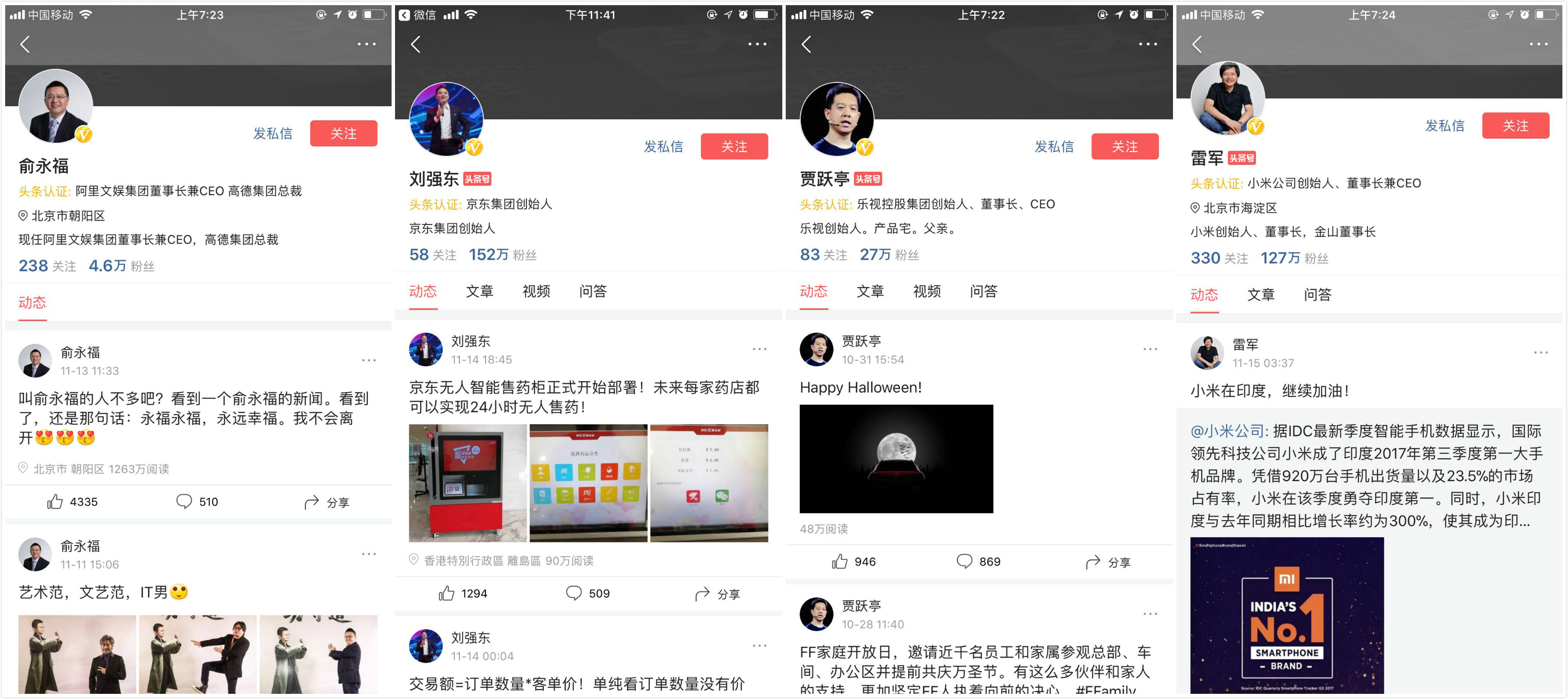 过去一段时间以来,京东掌门人刘强东、阿里大文娱的俞永福、小米公司CEO雷军、深陷舆论旋涡的贾跃亭等,都选择通过今日头条系产品微头条来发布最新的公司以及个人动态。