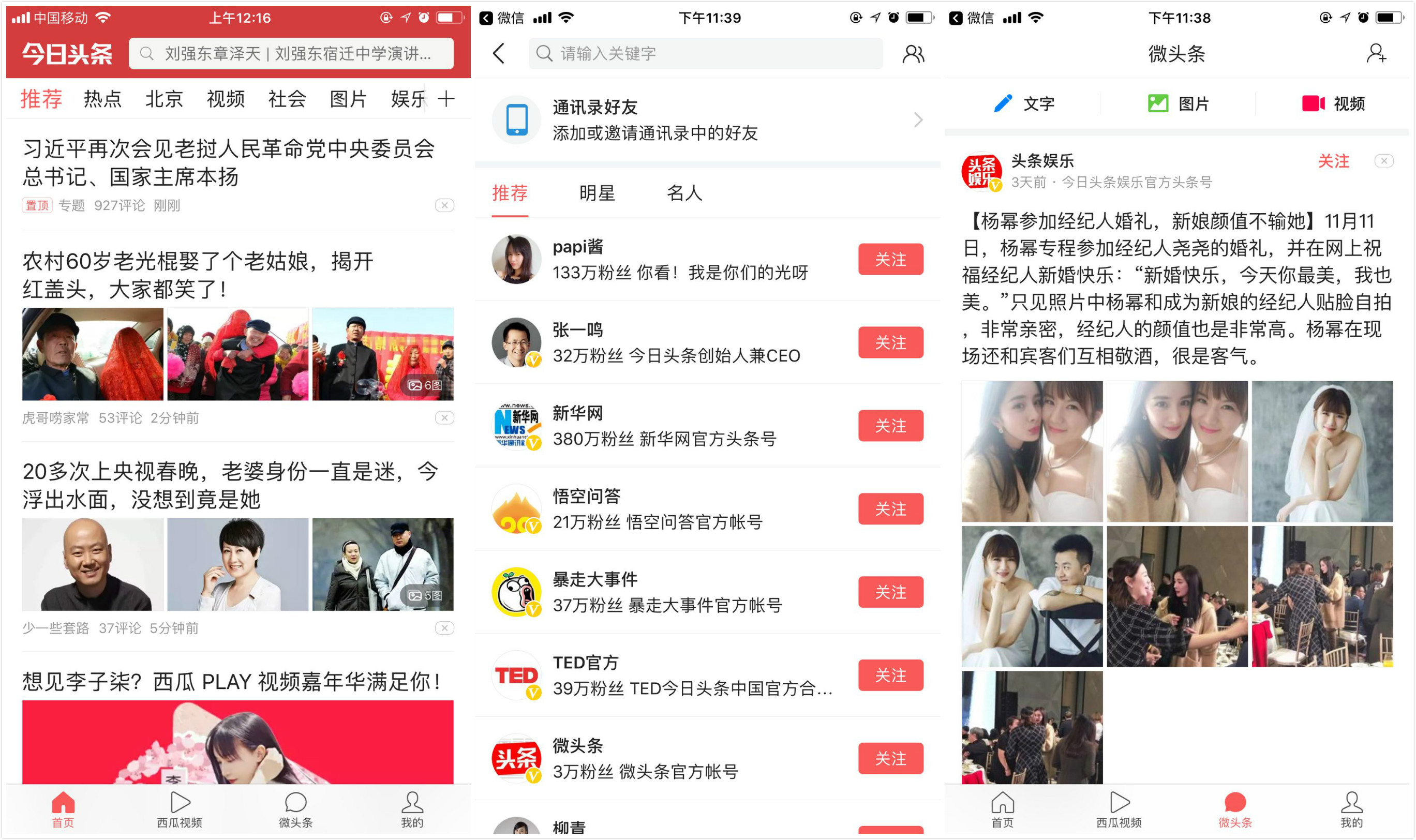除了为专业创作者提供更好的平台,我们更希望通过微头条,将现实生活中那些有名、有趣的人吸引进来,在微头条发布偏碎片化的短内容,其他用户可以关注他们,并进行互动。这些人的加入,以及发布的短内容,进一步完善了今日头条的内容生态。