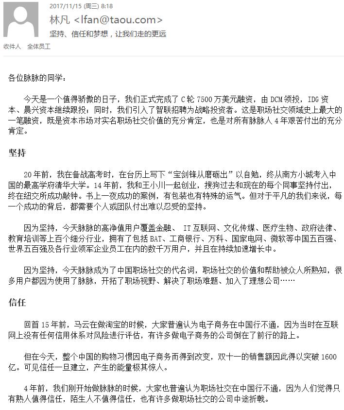 职场社交平台脉脉完成C轮 7500 万美元融资,DCM领投智联招聘入股