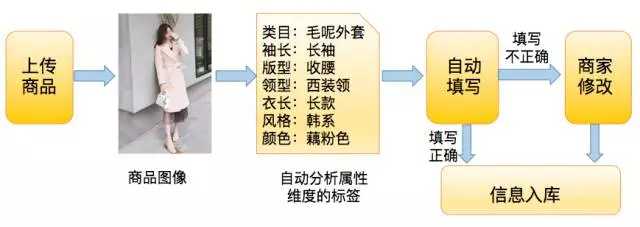 以服装类目举例,商家上传了商品图片后,我们通过图像标签技术模块,计算得到图中商品的一系列属性信息。例如图 8 所示,这些信息包括:类目(毛呢外套)、袖长(长袖)、版型(收腰)、领型(西装领)、衣长(长款)、风格(韩系)、颜色(藕粉色)等。利用这些信息,自动帮商家填写好对应的属性,节省了商家选择属性值的时间。当商家发现图像算法识别错误时,可以在自动填写的基础上,对已填写内容进行手动修改。整个流程能够大幅度减少商家上新填写信息所需时间,提升商家的业务效率。