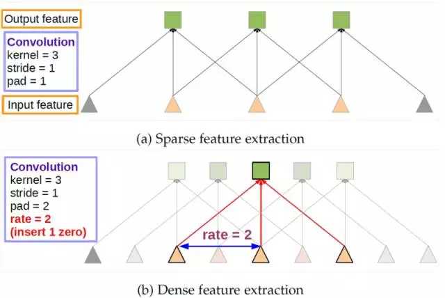 丢失的位置结构信息主要由于重复池化和下采样造成,因此我们的网络中移除了最后的若干个最大池化层下采样操作,并对滤波器进行上采样,在非零的滤波器值之间加入空洞,进行空洞卷积。如图 7 所示,(a) 中的常规卷积只能获取到较小感受野上的稀疏特征;(b) 中方法采用空洞卷积后可以得到较大感受野对应的更丰富特征,对应到服装语义分割也就保留了人体和服装之间的位置结构信息,有助于服装分割效果的提升。