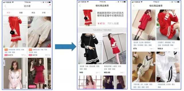 蘑菇街 APP 上提供了搜相似商品的功能。如图 4 所示,其过程是点击单个商品图像右下角的搜索图标,将与该图像相似的同类商品展现给用户。