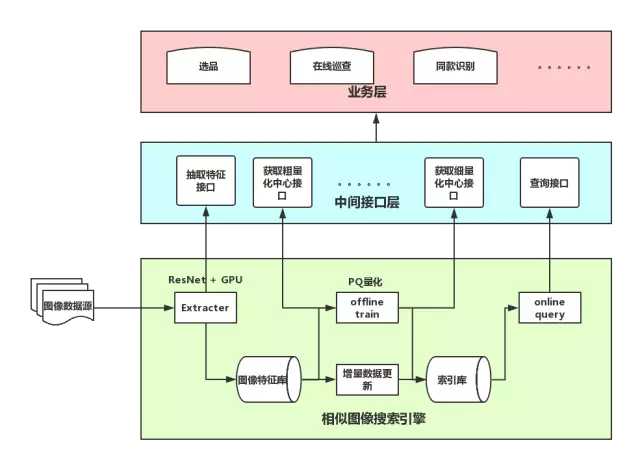 图像检索系统的整体架构如图 2 所示。基于底层的图像搜索算法,通过中间接口层提供给具体的业务使用,提升了相似图像搜索的扩展性,能够快速地响应实际的需求和应用。