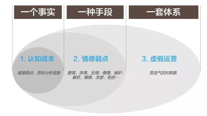 一句话概括:因为认知成本的存在,让情感挑动成为可能,最后通过虚假运营的组合拳来不断巩固和升级。