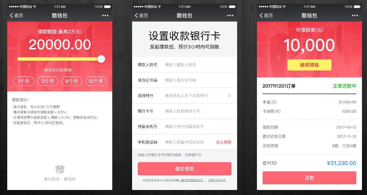 另外一个对用户有吸引力的因素,可能是酷钱包的低利息。酷钱包的放款额度从1000-2万元,周期1-12个月,月息只有0.9%。