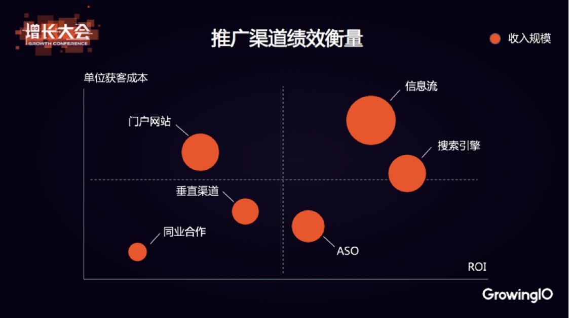 比如上面这张图,就是获客渠道推广的绩效衡量。横轴体现的是渠道的 ROI,纵轴是单位获客成本,圆圈的大小表示收入规模。通过这张图,你可以非常迅速地看到每个渠道的效果。