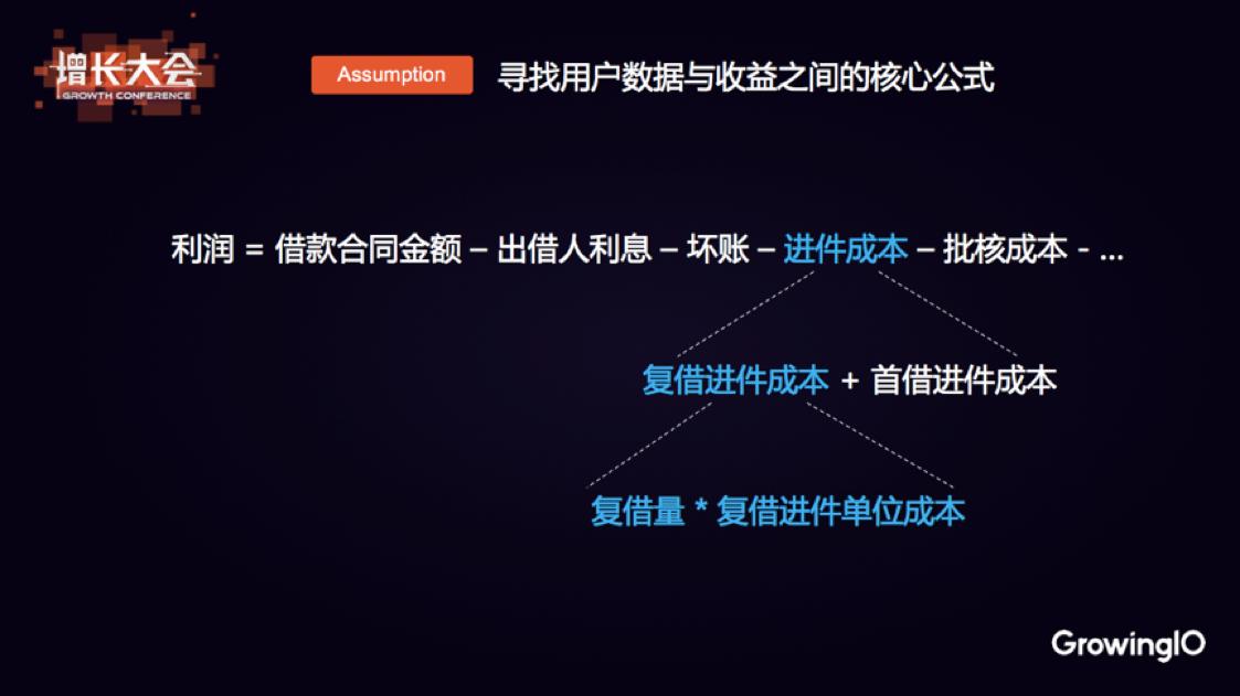 在这个公式中,所有的元素都是未知变量,需要更细地往下拆分和假设。比如我们拿到这个公式之后,可以根据自己的互联网产品经验进一步拆分进件成本,也就是获客成本,获客成本中分为复借获客成本和首借获客成本,复借获客成本又可以继续拆分为复借用户量与复借用户单位成本的乘积。然后用同样的思路继续拆分其他元素。