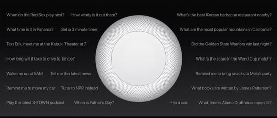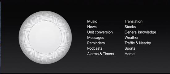 HomePod不仅仅局限于Apple Music和HomeKit控制。HomePod还可以播放苹果播客、设置闹钟、获得运动和天气更新、设置提醒,甚至发送信息。苹果这样评价HomePod和Siri的配合:因为内置有Siri,HomePod可以在以下流行的类别中接受和回答问题:定时器、时钟、测量、翻译、新闻、体育运动、天气、流量以及各种常识。