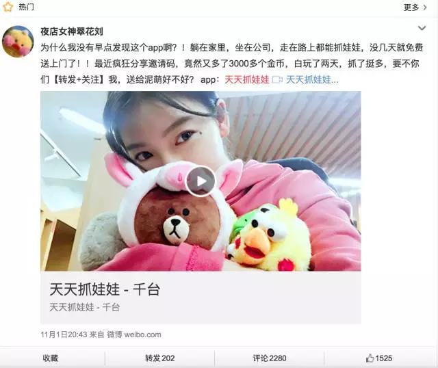 以目前入局的在线抓娃娃团队来看,《天天抓娃娃》是Same团队的内部创业项目,而Same曾获得腾讯领投的2000万美元的投资;《欢乐抓娃娃》获得了IDG资本的投资;《开心抓娃娃》的团队由糗事百科创始人王坚组建……有些团队的背景甚至涉及互联网金融、电商等等,它们往往或者拥有充沛的资金或者丰富的流量运营经验。有从业者称目前头部产品的日新增量应该在1万以上,也由此可见他们的推广力度。