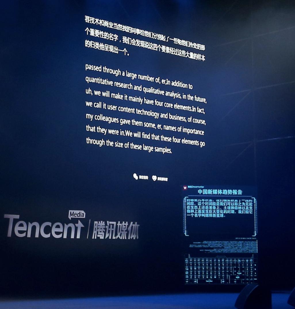 事实上,在他致辞的同时,腾讯微信智聆、腾讯翻译君和已经在腾讯上岗数年的机器人写作工具Dreamwriter三个AI产品通力合作,向现场所有中外嘉宾输出精彩的内容和报道,并实时推送给在线的所有观众。