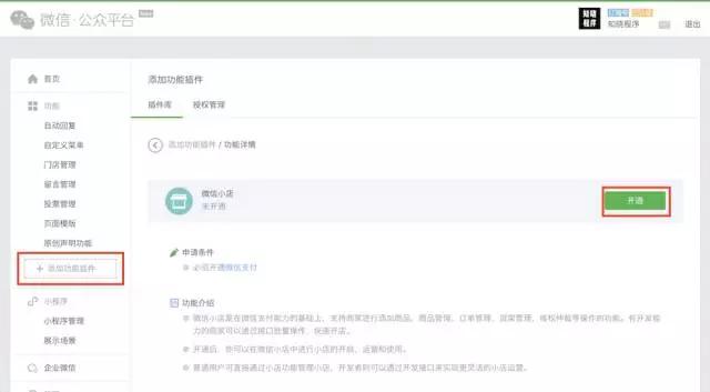 认证完成后,我们就可以用这个公众号登录公众平台,在左侧找到「添加功能插件」的选项,就可以在页面底部找到「微信小店」功能。