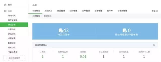 完成申请后,这个公众号后台的左侧「功能插件」中,将会新增「微信小店」功能。在这里,你就可以直接管理你的小店小程序。