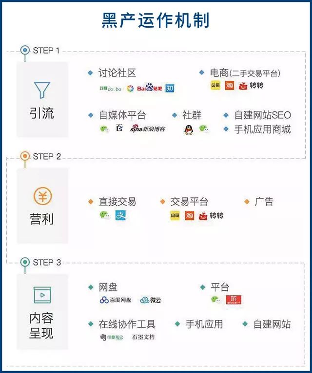 他也将黑产运作机制总结为三个步骤:
