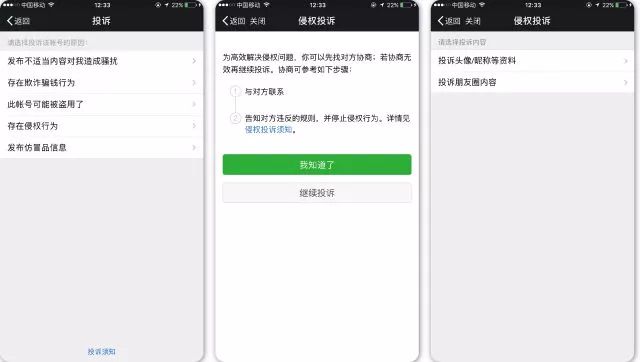 在微信账户投诉选项中,仅有“存在侵权行为”这一项比较符合情况。点击进入页面后看到的首先是微信端给出的建议是:找对方协商。坚持投诉的,仅有两个选项:投诉头像/昵称等资料;投诉朋友圈内容。