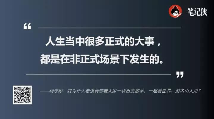 我为什么老强调带着大家一块出去游学,一起看世界、游名山大川?是因为人生当中很多正式的大事都是在非正式场景下发生的, “一块扛过枪、一块分过赃”,话糙理不糙。