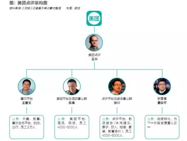 美团经历过数次大型的组织架构调整。2014年7月,美团首次设立事业部,此前酒旅、猫眼和外卖都是松散的组织。2015年7月第二次组织升级,成立外卖配送事业群、酒店旅游事业群、到店事业群及猫眼公司。在2015年底美团和点评合并后,公司经历了一段整合期,餐饮和综合为主,猫眼、酒旅和外卖小部分涉及。而最近一次调整是2017年1月,成立餐饮平台(王慧文负责)、美团平台及酒旅事业群(陈亮负责)、点评平台及综合事业群(张川负责)。