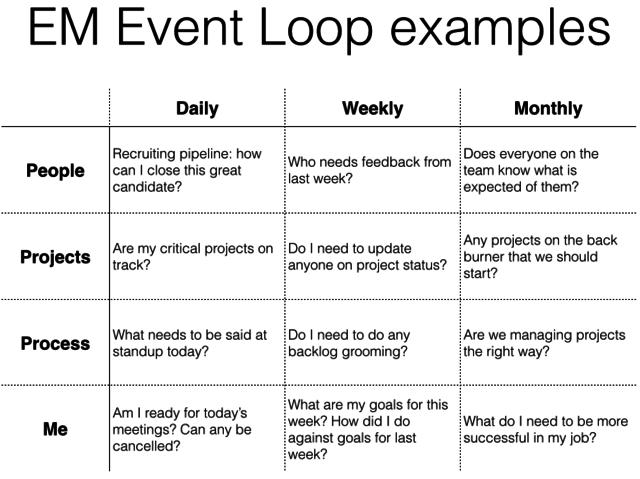 (3)给自己建立一个“事件循环表”。一个事件循环表是一个每天,每周,每月都需要重新审视的代办清单。这一循环的目的在于确保你在繁杂的工作中不要忽略了最重要的那些事件。每周和每月的事件循环是最艰难的,因为你并不常常思考这些问题,但是他们的重要性也不容小觑。“下面这个是图表是David给一个工程部管理者的事件循环例表: