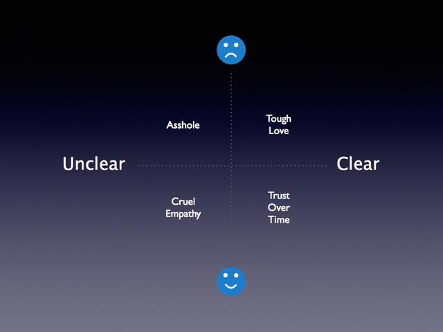 Scott 把反馈意见划分出四个象限。横轴代表反馈的清晰度:从不清晰到清晰,纵轴代表代表对方可能有的情绪:从不开心到开心。第四象限就代表了温和却不清楚的反馈。好的做法是右上角第一象限:即使是坏消息,也要如实的反馈给你的员工。