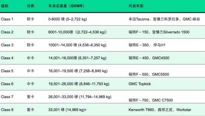 根据北美的卡车分级标准,8级是载重卡车级别中的最高级了。它的车身总重量在3万3千磅以上(大概是1万5千公斤)。