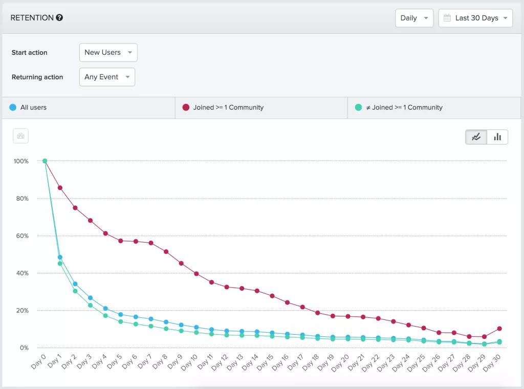 接下来你还要制作保留图表。上面这张图表显示的就是所有用户中新用户的保留率,还有加入社区和没有加入社区的人有多少。你可以制作相似的图表对用户分类,包括完成“惊喜时刻”的人,没有完成的人。如果你注意到二者有明显的差异,正如上图看到的,那就是说“惊喜时刻”与保留率有很大的关系。