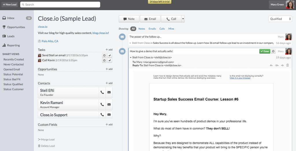 Close.io是一个CRM解决方案(帮助用户对销售前景和机会进行管理),它可以降低数据门槛,帮你提高生产力。Close.io可以自动追踪所有活动,注册之后,产品迅速将用户引导到联系人屏幕。在屏幕上,你可以看到历史信息,也就是你与联系人交流的历史信息,因为数据是最新的样本数据(比如会话数据),这样Close.io就可以帮助用户找到“惊喜时刻”,即使并非所有必要数据都备齐也没有关系。