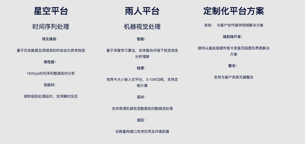 在这两个合作案例中,团队抽象出了针对机器视觉数据的雨人机器视觉处理平台和针对时空序列的星空平台。两者都是从最底层硬件板卡到顶层应用的全套解决方案。前者主要基于深度学习算法,支持复杂环境下的视觉信息分析与处理,功耗可以做到3-10瓦;后者主要基于对历史数据进行自动异常检测,可以做到160Gps时间序列数据微妙级延时。