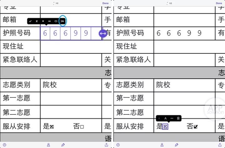 如果觉得内置的信息项不实用,可以点击左下角插入自定义字段(比如国内用完整地址比分级地址频繁)。之后轻点表格中需要填写的地方,点击键盘上方同样的人形按钮就能填充字段啦。同样点击钢笔图标还能预设 / 插入签名。