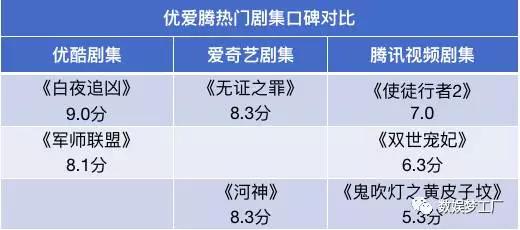 对比来看,同为犯罪题材,优酷的《白夜追凶》和爱奇艺的《无证之罪》分别在豆瓣上拿到了9.0和8.3的高分,而《使徒行者2》虽然也有港剧粉丝热情支持,但评分为7.0。同为古装题材,优酷的《军师联盟》拿到8.1分,《双世宠妃》评分仅6.3分。而同样是网文大咖天下霸唱的作品改编,《鬼吹灯之黄皮子坟》仅5.3的低迷口碑不复第一部《精绝古城》受到的追捧,也远被《河神》8.3的评分甩在身后。
