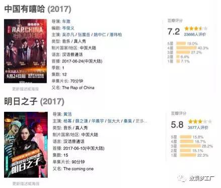 对比综艺,腾讯今年力推的《明日之子》虽然同样收获了惊人的播放量,但和爱奇艺的现象级作品《中国有嘻哈》相比,在话题热度和口碑上还是有不小的差距。从豆瓣评分来看,《中国有嘻哈》2.3万多人打出7.2的分数,而《明日之子》3577人只给出了5.8分的评价,关注人数和评分都明显不及前者。