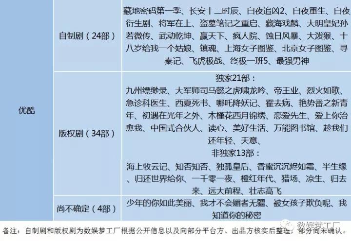 数娱梦工厂整理发现,剧集数量最多的是爱奇艺的79部(40部自制剧、39部版权剧),其次是腾讯的67部(30部自制剧、31部版权剧、另有6部暂未确认)以及优酷的58部(22部自制剧、32部版权剧、另有4部暂未确认)。