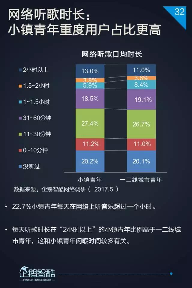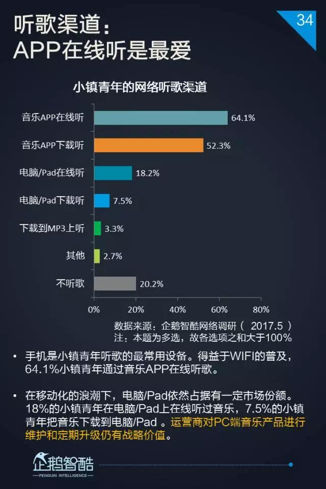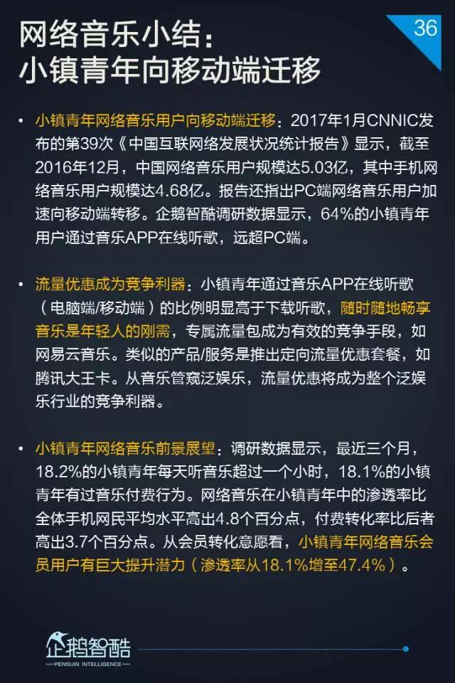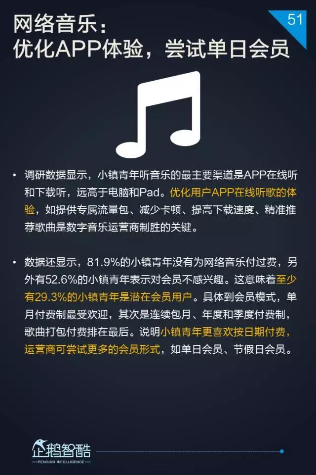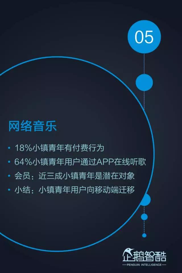 3. 网络音乐处于中位区间,三个维度的数据都相对均衡,更适合面向小镇青年用户进行差异化服务覆盖。