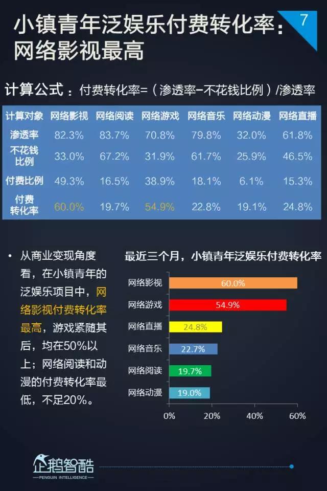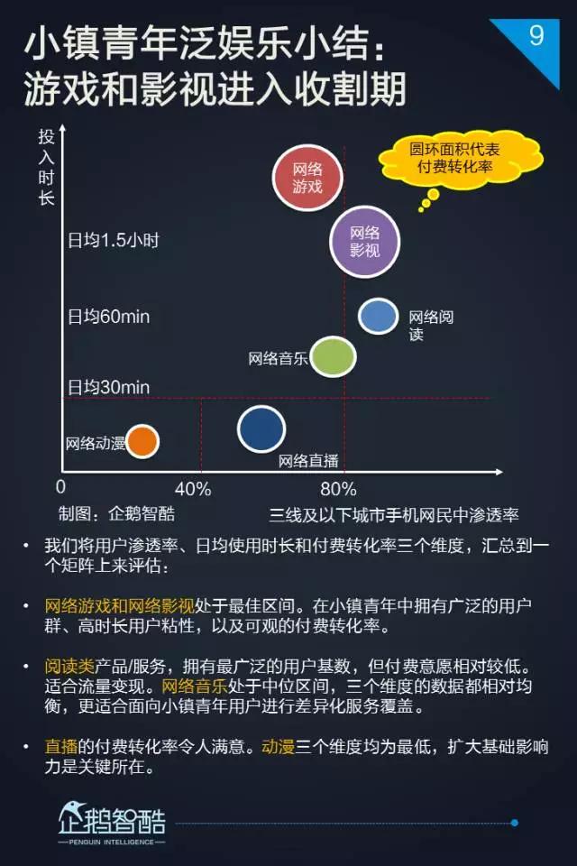 网络游戏和网络影视处于最佳区间。在小镇青年中拥有广泛的用户群、高时长用户粘性,以及可观的付费转化率。