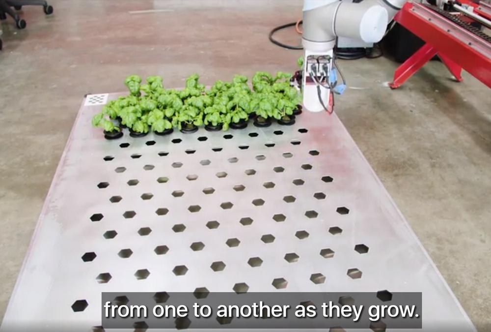 之后需要关心的就是植物生长的问题了。如果是在传统农场,农民必须对它们进行分离操作,以保证作物有足够的生长空间。而在Iron OX的温室农场里,操作这件事情的是智能机器人手臂,它会采用不同间距的托盘,并将这些作物从一个地方移到另一个地方。